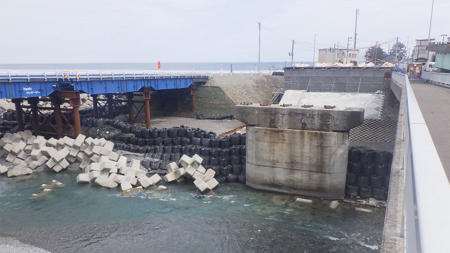 青海川橋は、日本海の荒波の影響を直接受ける厳しい塩害環境下に位置しています。 そのため、塩害劣化による鋼材の腐食や損傷が著しい橋梁が確認されています。 塩害劣化が進行すると、コンクリートの剥離や強度低下を引き起こし、最終的には橋の崩壊に繋がります。 このことから、安全で円滑な交通を確保することを目的とした事業として、恒久的対策としての架替え工事を行います。 当工事はその塩害により劣化した橋脚を撤去する工事です。